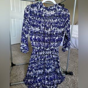 Blue, black and white abstract pattern dress. Purchased from Nordstrom, in EUC. Features crossover neckline with cinched waist and 3/4 sleeves. Can also be worn as a tunic over pants! #business #corporate