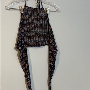 Very cute navy blue with red pattern halter top with tie back. Slightly worn.