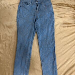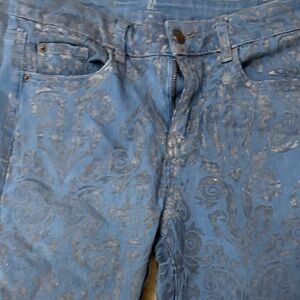 Stylish blue jeans with an intricate pattern. Perfect for casual wear. Some wear as shown in pics. Varied color and design in pattern.
