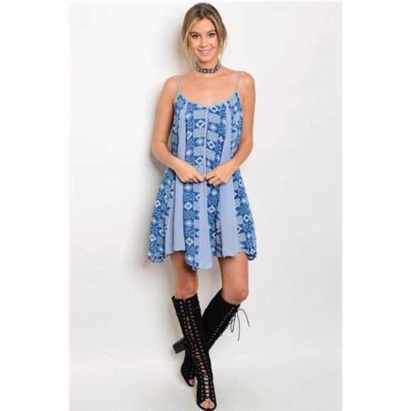 This stylish blue mini dress features a unique pattern, perfect for any occasion. Its vibrant design adds a touch of elegance to your wardrobe.