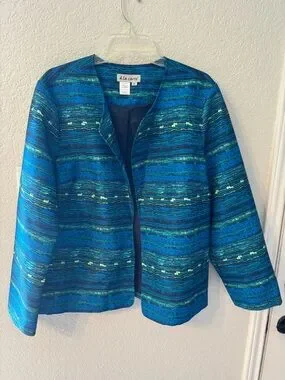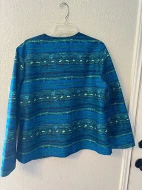 blue patterned open-front jacket. Lightweight structured design with shimmering horizontal stripes. Versatile piece that pairs well with dresses or trousers. Comfortable lined interior for easy wear.