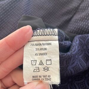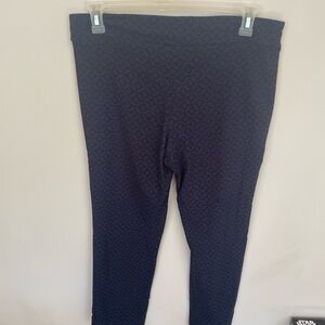 Elegant navy pants with intricate pattern. Ideal for versatile styling.