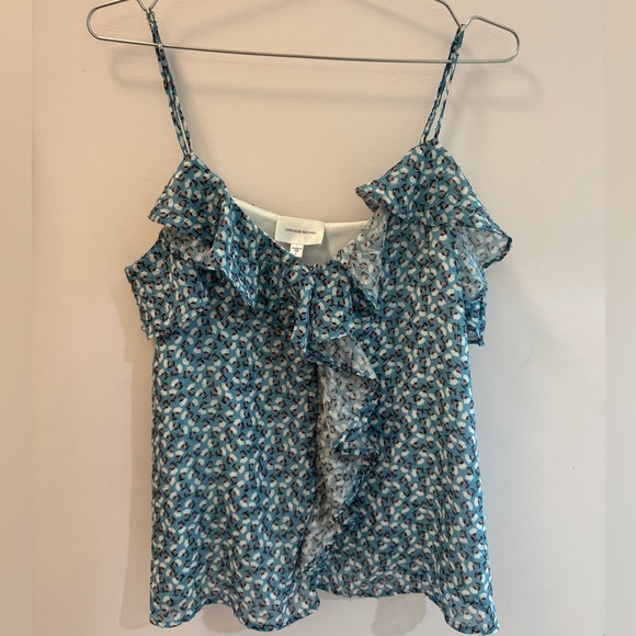 Chic camisole with a blue pattern. Features stylish ruffles. Ideal for casual wear. Fits like a medium/large