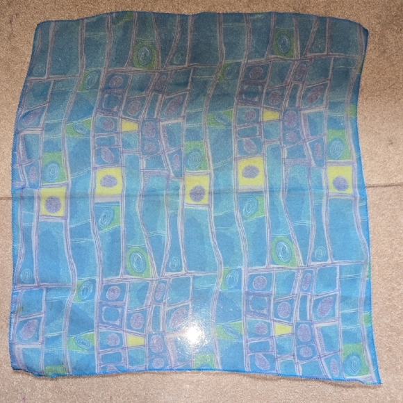 Stylish blue scarf with a unique pattern. Perfect for adding a pop of color to any outfit. Not silk, probably polyester and has sewn edges. Measures 18.5 by 20 inches. Few minor staining see photo.