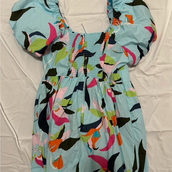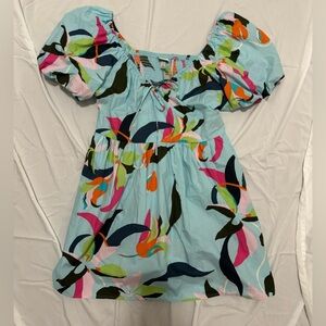 Blue colorful patterned dress from A new day with puff sleeves and bow detail in front. Never worn, tags removed.