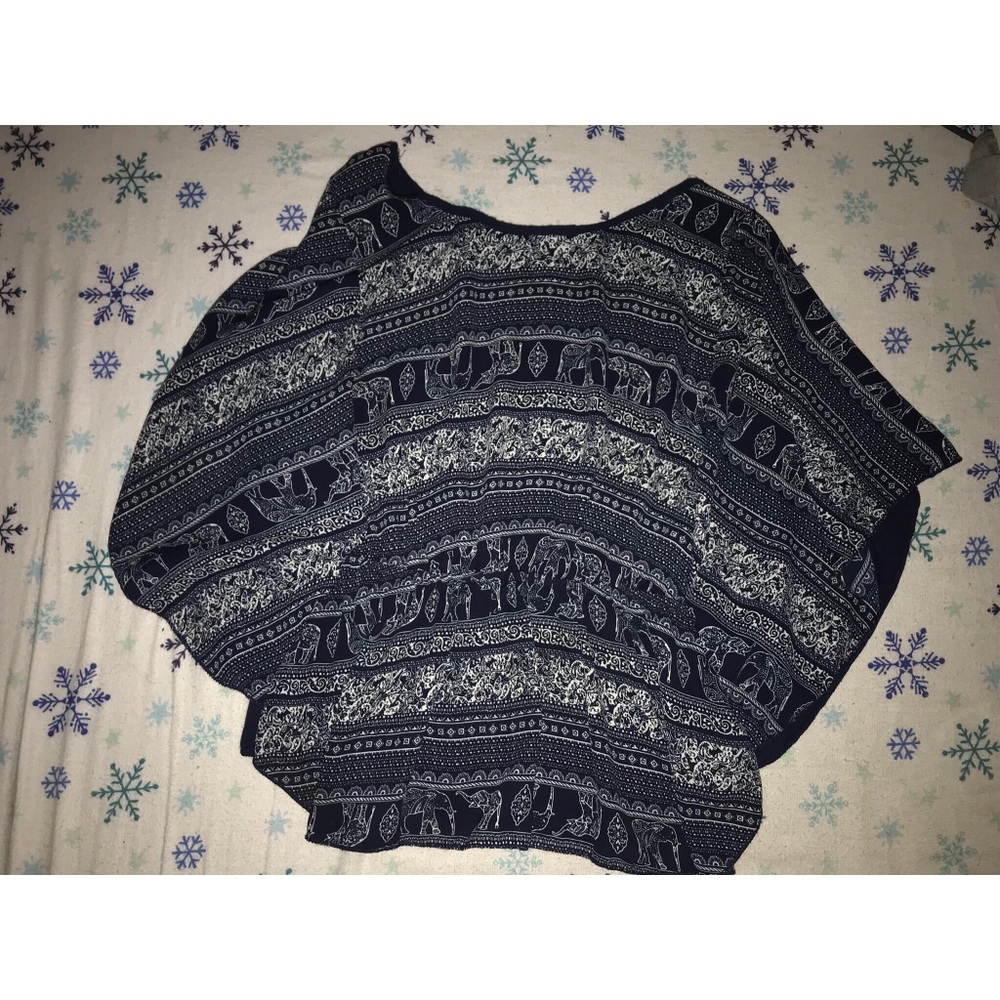 Elephant/Indie pattern, lays like a poncho but with a stretchy band in the middle. Worn many times, in perfect condition. Back is a bit see through while the fabric is dark.