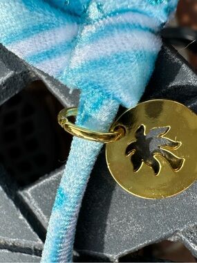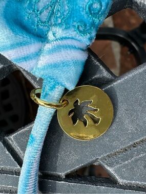 Two-piece triangle string bikini in vibrant aqua blue pattern. Adjustable ties at neck, back, and sides for a custom fit. Soft stretch swim fabric with subtle decorative trim and a small gold-tone charm. Perfect for beach days and poolside lounging in blue.