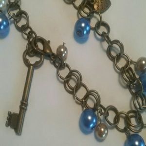 A lovely little blue, white, and bronze pearl bracelet with a key and heart charm, and a mini blue art painting from the artist Michelle Trousseau.