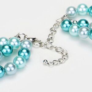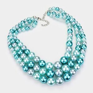 Necklace is comprised of simulated graduating shades of blue faux pearls on 3 strands.