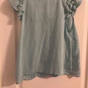 Cute blue tank with ruffled sleeves and lace at the bottom.Buttons down the front.
