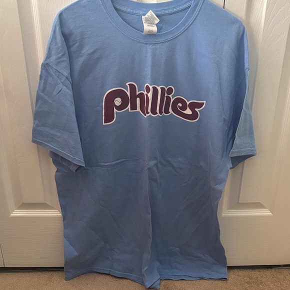 Casual blue t-shirt featuring Phillies logo. Perfect for fans.