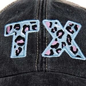 Blue Pink Leopard TX Texas State Embroidered Black Distressed Trucker Hat