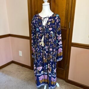 This casual sundress features a vibrant floral pattern in shades of pink and blue, set against a flowing silhouette. The scoop neckline and bishop sleeves add a touch of elegance, making it perfect for resort wear. Its intricate design and relaxed fit ensure both style and comfort.