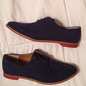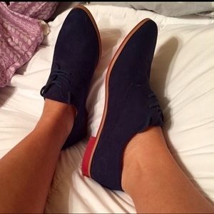 -Suede navy oxfords with pink bottoms have been lightly worn - no damage to inside of shoe or bottom sole of shoe