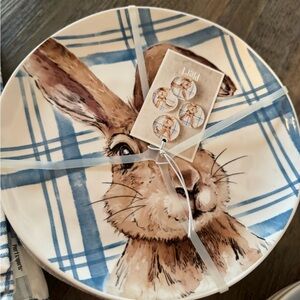 Charming oval plate with a rabbit design. Features a blue plaid pattern. 8 plates in total