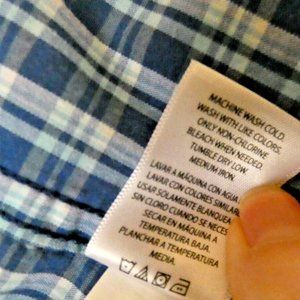 Dark Blue that goes to light blue plaid. Pointed collar with buttons. 1 Pocket. (see photos)