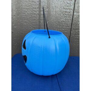This lightweight and durable blue plastic Halloween pumpkin bucket features a sturdy handle, ideal for candy collection or as a festive decoration.