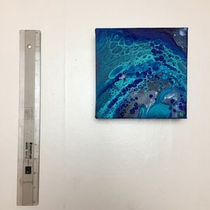 This Blue Pour Painting has beautiful blue detailing, with also a hint of a metallic blue color tomato it really. This piece is a nice piece to add to you home.
