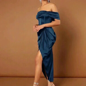 Blue Preppy Womens Off Shoulder Ruched Draped Asymmetrical Hem Dress