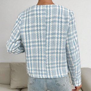 Blue Preppy Womens Plaid Pattern Open Front Overcoat