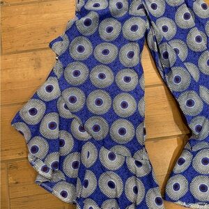 Vibrant blue printed wide-leg pants with playful ruffle hems.