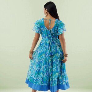 Step out in style wearing this blue printed chiffon knee length dress. Ideal for both casual and formal occasions, it elevates your style quotient with ease.