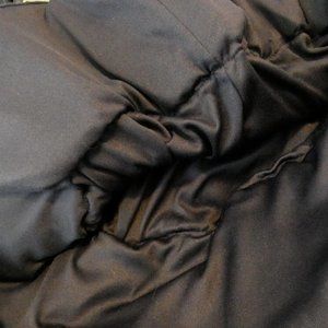 Zipper in the back. The front dips in a "V" or sweetheart with extra pads in the corset top that push up your girls and make them look spectacular. Fully lined.