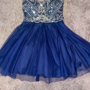 Short Blue prom dress worn once. Sewed on clear straps. The size is 3/4. It zips up and has a tie in the back.
