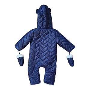Navy Blue Puffer Snowsuit Bunting with Hood (white ears), Attached Mittens and Fuzzy Inside. Baby Size 90 / US 2T.
