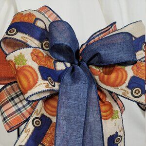 Blue Pumpkin Truck w/Plaid Lantern Bow, Summer Fall Bow, Farmhouse Welcome Bow