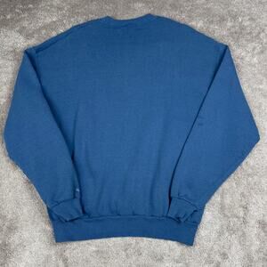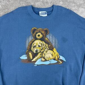 This is a charming vintage sweatshirt featuring a delightful appliqué or embroidered graphic of a cute puppy dog and bear, appealing to the popular Granny/Grandma core aesthetic. The light blue color and the adorable characters make it a cozy and whimsical piece perfect for casual, everyday wear. It offers a nostalgic, handcrafted look that is highly sought after by collectors of vintage cute apparel.