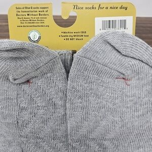 Blue Q tag socks in size L-XL, made from organic cotton in gray color. The design features the phrase "50% Don't Know, 50% Don't Care." These unisex socks offer a unique and humorous style for those looking to add some fun to their sock collection.
