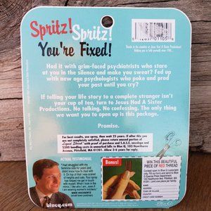 If telling your life story to a complete stranger isn't your cup of tea, spritz! Spritz! You're fixed! For best results, use spray, then wait 25 years.