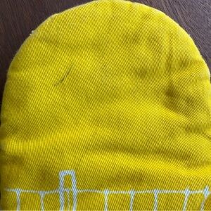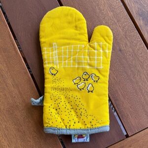 Vibrant yellow oven mitt with playful design. Gray accents add contrast. Made from 100% cotton.