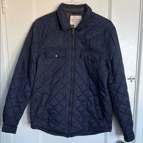 Stay warm and stylish in this quilted semi-puffer jacket in a deep indigo blue color, featuring a diamond-shaped stitching pattern, two front pockets and one inside breast pocket.
