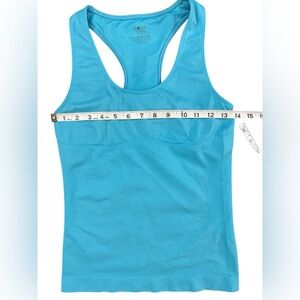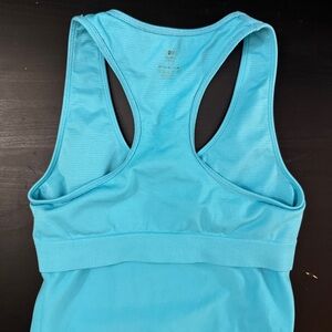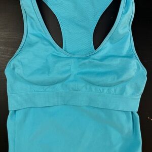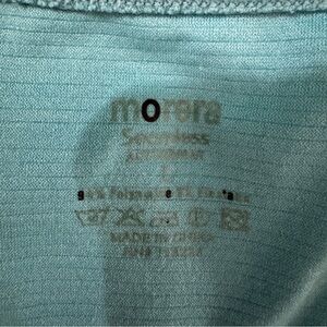 Really well made full length racer back work out top by Morera. Tagged large but it fits more like a medium so be sure to check measurements. The only sign of wear is some fading of the tag less label inside. Full built in shelf bra so you don’t need anything underneath! Beautiful bright teal color!