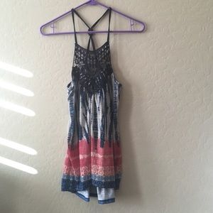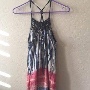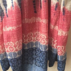 High neckline with crochet detailing and red, white, and blue pattern. Never worn.
