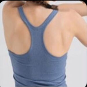 Blue racerback tank top. Ideal for fitness or casual outings. Ribbed with built in bra for light support and coverage.