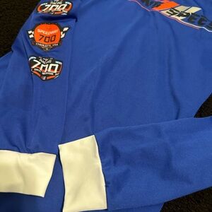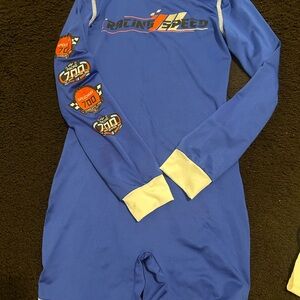 Blue racing jumpsuit with Racing Speed logo. Features white accents and racing patches on the sleeve.