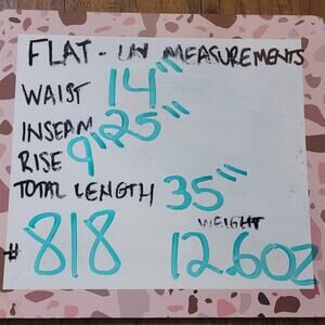 Measurements: Waist 15" flat, Inseam 28", Rise 9", Total length 35"