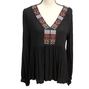 Blue Rain Black Top with Tribal Trim Long Sleeve V Neck Medium