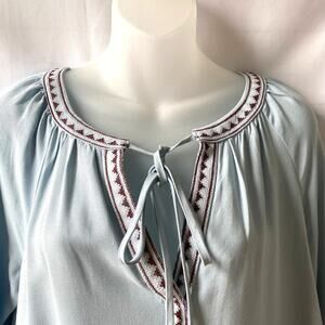 Blue Rain by Francesca's Mini Tunic Dress in light Blue with artsy southwestern burgundy embroidery.
