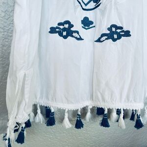 Blue Rain Boho Embroidered Tassel Beaded Design Lightweight Top S