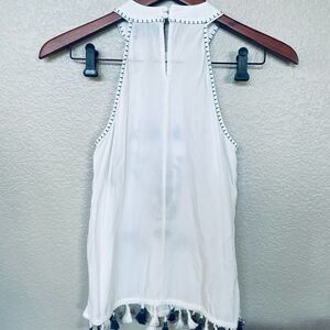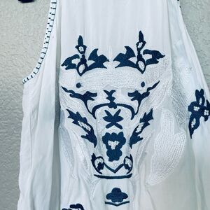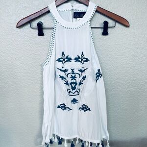 Women’s or juniors size Small Blue Rain Beautiful bright white lightweight sleeveless tank blouse in excellence preowned condition. No noticeable flaws. Teal blue embroidered and beaded boho design on front and tassels around lower hem. Loose lightweight and flowy. Clean, nonsmoking home. Looks very similar in style to Johnny Was.
