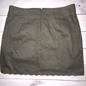 Add some earthy charm to your wardrobe with this stunning embroidered skirt by Blue Rain. Features intricate red, white, and olive floral embroidery on a deep olive green base. Scalloped hem and side zip closure add to its unique and feminine vibe. Made of 100% cotton for breathable comfort.