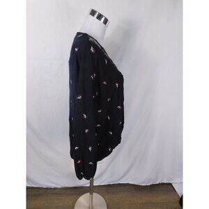 Charming and feminine, this Blue Rain by Francesca’s blouse features detailed rose embroidery in muted mauve and ivory on a deep black background. The soft rayon fabric drapes in a faux-wrap front with elastic hem, lending a flattering silhouette. A beautiful choice for Cottagecore, Boho Witch, or even Dark Academia aesthetics.
