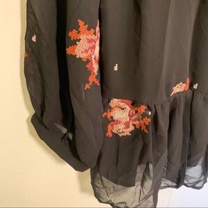 Good condition, new with tags but missing button at top of keyhole Blue Rain. Francesca's. Roxi cross stitch floral blouse. Black with red, pink and white cross stitch pattern. Crewneck. Peplum hem. 3/4 sleeve. Style CT4499F. Size small. 100% polyester. Pit to pit laying flat 18.5” Shoulder to hem 23” Sleeve (pit to hem) 14”. All measurements are approximate and taken lying flat. Smoke free home. No trades, offers welcome.