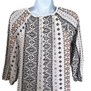 Features: Boutique brand, 100% rayon material, lined (white), scoop neck with tie and tassels down front, 3/4 sleeve, boho print style.