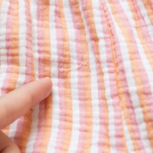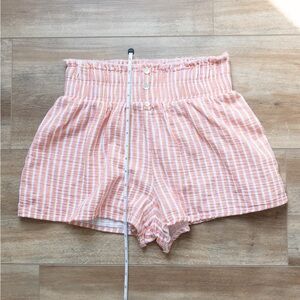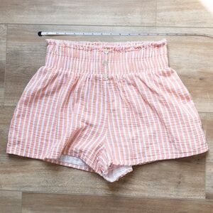 Chic high waist shorts with pink and white stripes. Features elastic waistband and button detail. Perfect for casual wear.