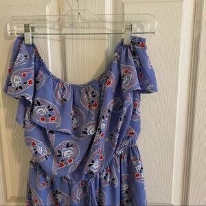 Blue Rain Paisley Print & Rose Romper / Jumpsuit in women’s size small. Pretty blue color with blue Roses and red flowers in a paisley print. Elastic around waist & drawstring tie. Perfect for 4th of July & summer! Shorts w/ inseam measuring approx 2.5 in. Pit to pit measures approx 17 in, length down center front measures approx 23 in. In very good used condition w/ no flaws or stains and minimal wash wear. Please see close-up pictures for condition details. Off the shoulder. Lined. Spring. Vacation ready. Beach. Cruise.